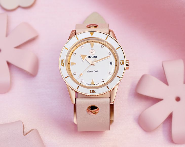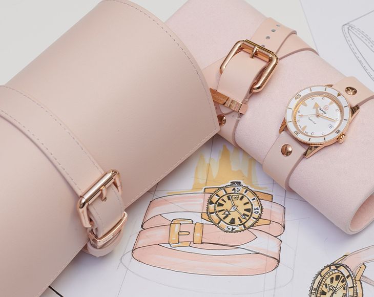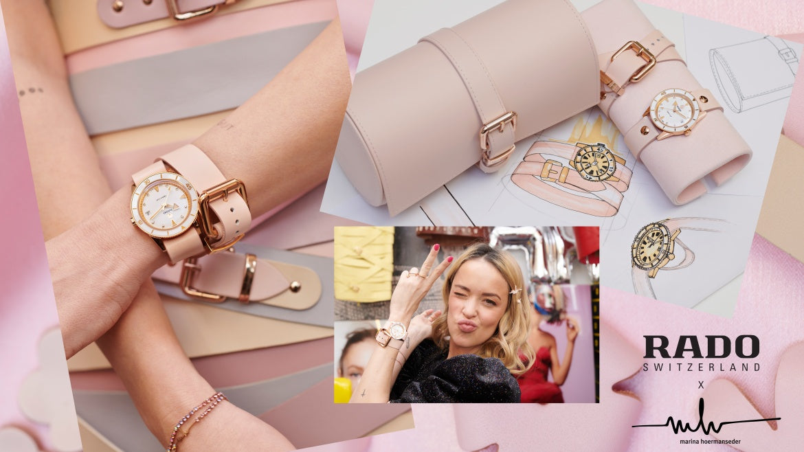 In cooperation with the swiss watch brand Rado, Marina Hoermanseder recreated the timeless watch model Captain Cook. An exciting collaboration that combines tradition, high quality materials and outstanding design elements. Being known for working with leather straps and buckles, it was clear for Marina Hoermanseder to create a watch using her signature elements. In result arose a watch that stands out through its feminine, powerful and expressive design. Buying the Rado Captain Cook x Marina Hoermanseder you will get three varying leather watch straps with easy-clip-system that enable the owner to switch very easily between the different options. Having a watch strap in timeless black and two different rose variants the accessory with roségold details will match every outfit and leave nothing to be desired. The set is rounded off by a matching storage box that is perfect to use while traveling.